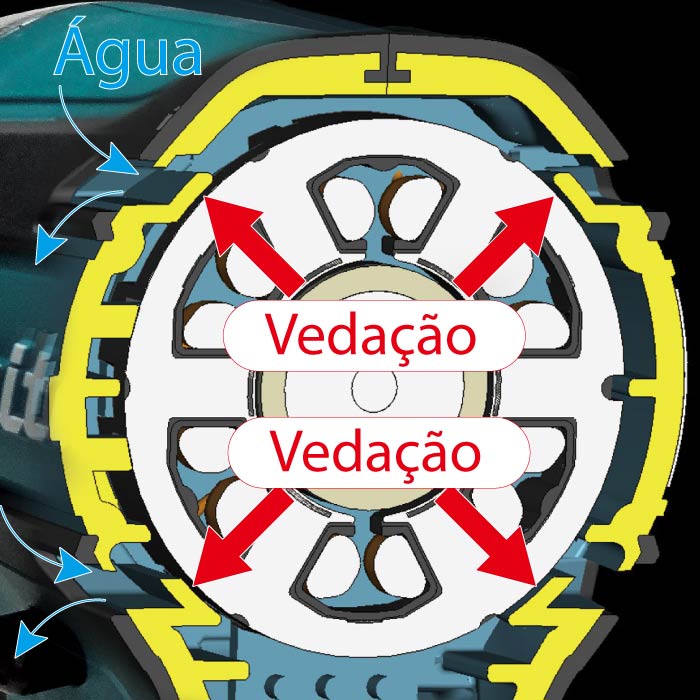 Mesmo que ocorra a entrada de água, existe uma segunda vedação, conforme a ilustração, que também tem o objetivo de expulsar o fluxo de água para fora da ferramenta, protegendo seus componentes elétricos e conexões com a bateria.